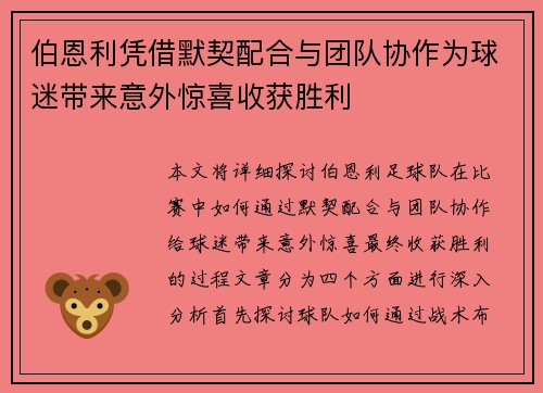 本文将详细探讨伯恩利足球队在比赛中如何通过默契配合与团队协作给球迷带来意外惊喜,最终收获胜利的过程。文章分为四个方面进行深入分析,首先探讨球队如何通过战术布置与球员间的默契配合形成优势,其次分析球队在场上展现出的团结精神及互相支持,接着讨论...