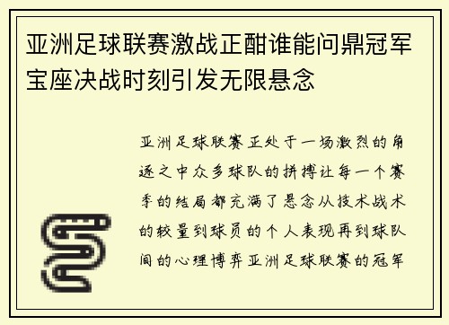 亚洲足球联赛激战正酣谁能问鼎冠军宝座决战时刻引发无限悬念