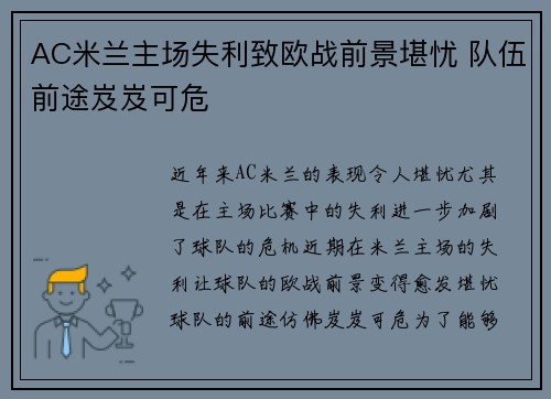 AC米兰主场失利致欧战前景堪忧 队伍前途岌岌可危