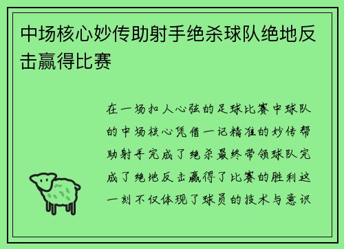 中场核心妙传助射手绝杀球队绝地反击赢得比赛