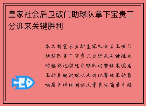 本文将重点分析皇家社会后卫破门助球队拿下宝贵三分迎来关键胜利的精彩过程,结合球队的整体表现、后卫的关键进球以及对比赛结果的影响,展开详细阐述。文章首先简要介绍本场比赛的背景,并分析皇家社会后卫在比赛中的表现。接着从四个方面深入探讨这场比赛对...